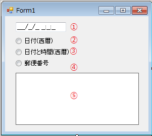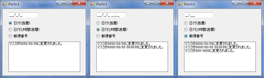 このイベントでは、MaskedTextBox1のMaskプロパティが何に変更されたかを、Label1に表示する処理をおこなっています。