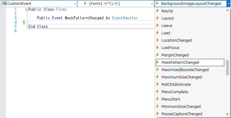 今回宣言するイベント「MaskPatternChanged」の引数は、他でよく見るイベントと同様、自身のコントロール、senderオブジェクトとEventArgsとなるようにしています。