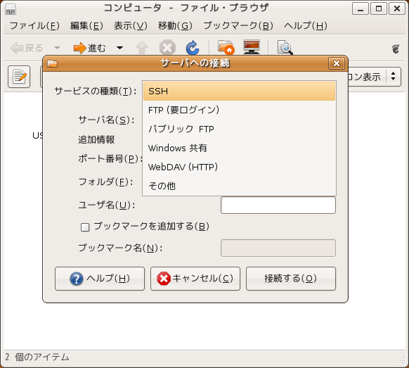 探してすぐに分かったのですが、なんとGNOMEの標準ファイラであるNautilusはSSH、FTP、WebDAV、Windows共有と凡そ必要とされるネットワークディレクトリへのアクセスを標準でサポートしています!