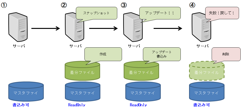 そもそも、バックアップとは不具合が発生した際に元の状態(取得したタイミング)に戻せることが必須条件だと思いますが、スナップショットの仕組みでは、マスターファイルと差分ファイルが生成され、差分ファイルのみに最新情報が書き込まれていきます。