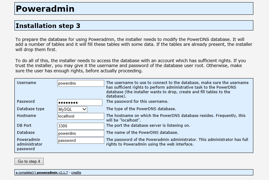 MariaDB [(none)]> GRANT SELECT, INSERT, UPDATE, DELETE ON powerdns.* TO 'powerdns'@'localhost' IDENTIFIED BY 'password'; MariaDB [(none)]> exit