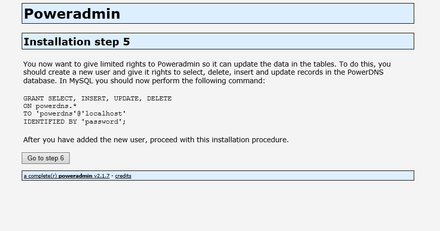 MariaDB [(none)]> CREATE USER 'powerdns'@'%' IDENTIFIED BY 'password'; MariaDB [(none)]> GRANT ALL PRIVILEGES ON powerdns.* TO 'powerdns'@'%' IDENTIFIED BY 'password'; MariaDB [(none)]> GRANT ALL PRIVILEGES ON powerdns.* TO 'powerdns'@'localhost' IDENTIFIED BY 'password';
