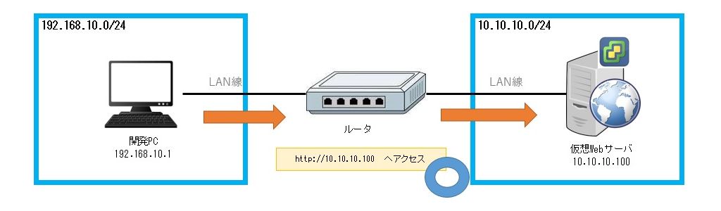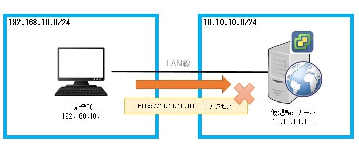 開発PC(192.168.10.1)から仮想Webサーバ(10.10.10.100)へはセグメントが異なるので直接通信をすることはできません。