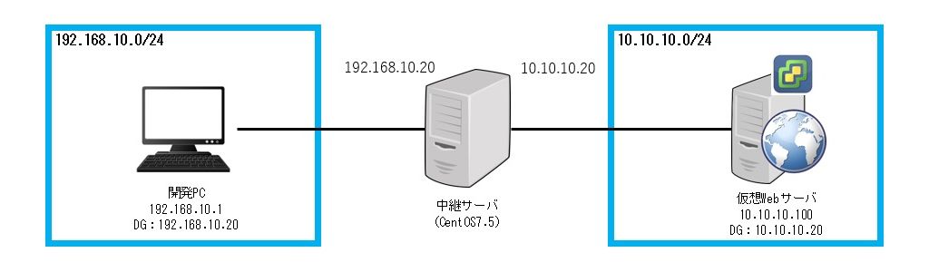 開発PC、仮想Webサーバのデフォルトゲートウェイ(DG)は、中継サーバのIPアドレスを指定すること