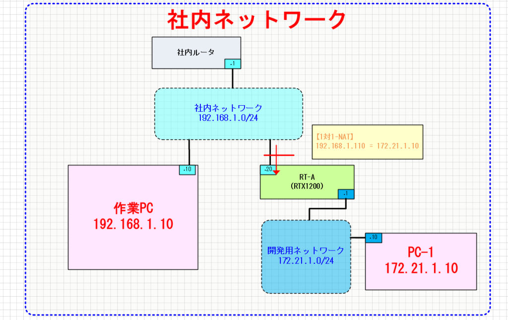 ・作業PC と RT-A が社内ネットワークのデフォルトゲートウェイ(社内ルータ)