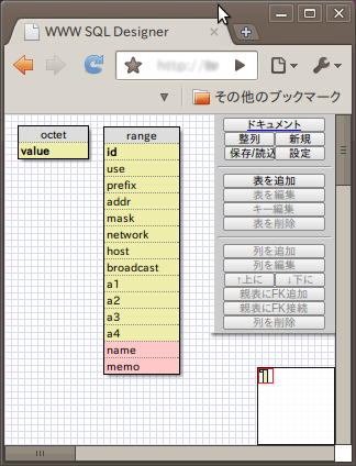 rangeテーブルはロングIP形式で1つのレンジに関する情報と、それ以外にも「予約/割当済み」判別用の”use”、ドットアドレスの”a1~a4″、人間向け記録領域としての”name”、”memo”などがあります。