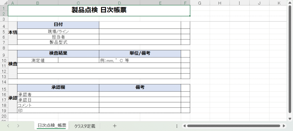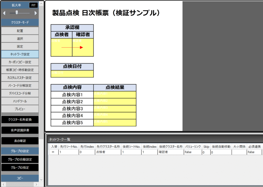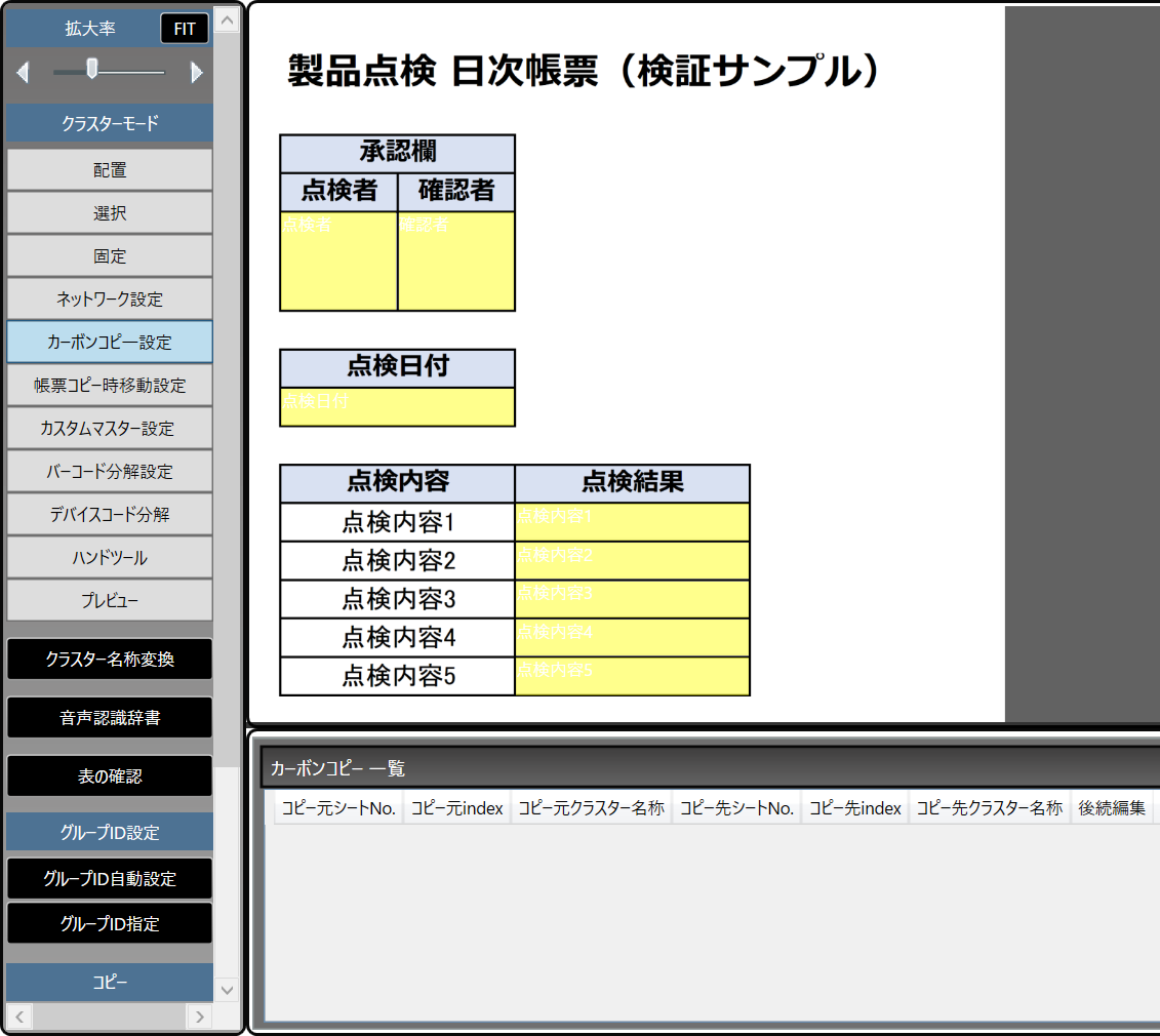 対象としたのは帳票でよくある日次帳票で、「日付」「検査結果」「承認欄」項目を設けたレイアウトをどこまで作成できるのかを検証することにしました。