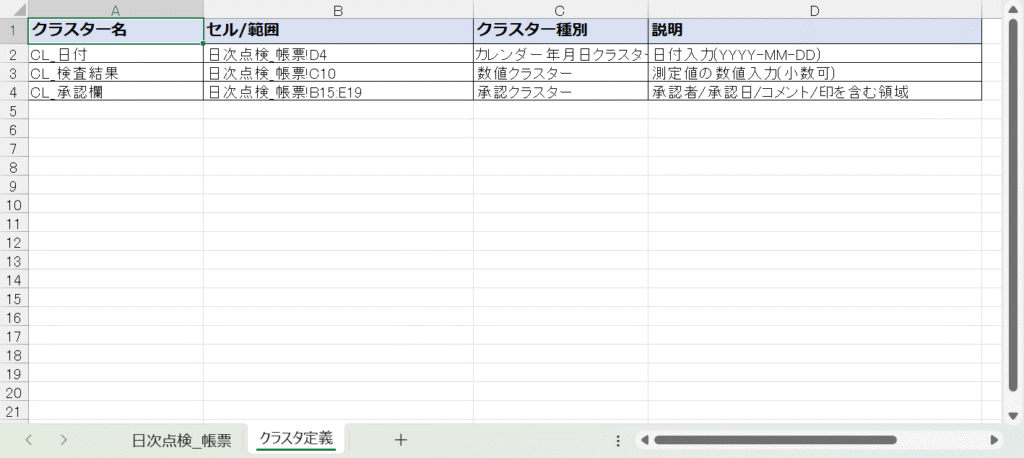 Copilotを用いて作成したExcelの帳票定義には、i-Reporterのクラスターは設定されていませんでした。